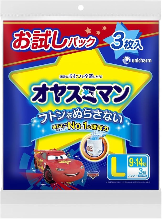 名 称 オヤスミマン 男の子L お試しパック 内容量 3枚入/Lサイズ:9~14kg 特 徴 フトンをぬらさない140%※の吸収パワー 紙おむつビッグサイズの140%※の吸収力で、一晩中しっかり吸収してもらしません。お子様は安心してぐっすり眠れます。※製品比 寝返りに超密着ギャザー 密着度約2倍※。いっぱい動いてもぴったり。 ※ユニ・チャーム株式会社従来品比 ※足まわりギャザー部がお肌にフィットしている面積。(Lサイズにおける想定値)赤ちゃんの体型やおむつのつけ方によって個人差があります。 お兄ちゃん気分で、お気に入り。 大人気の「カーズ」を採用した下着デザインで、気に入ってはいてくれます 一袋に3種類のデザインが入っています。 しなやかソフトストレッチ素材 布のように気持ちいいはきごこちの新素材が、動きに合わせてやさしくフィット。 素 材 素材 表面材・・・ポリオレフィン、ポリエステル不織布 吸水材・・・綿状パルプ、吸水紙、高分子吸水材 防水材・・・ポリオレフィンフィルム 伸縮材・・・ポリウレタン 結合材・・・スチレン系エラストマー合成樹脂 外装材 ポリエチレン 区 分 ベビー紙おむつパンツ式 ご注意 実際の商品とキャラクターが一部異なる場合がございます。 また、商品の色はお選びいただけません。ご了承ください。 本品記載の使用法・使用上の注意をよくお読みの上ご使用下さい。JANコード:4903111156320