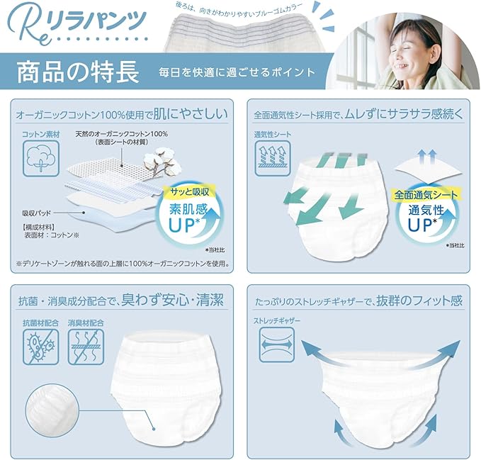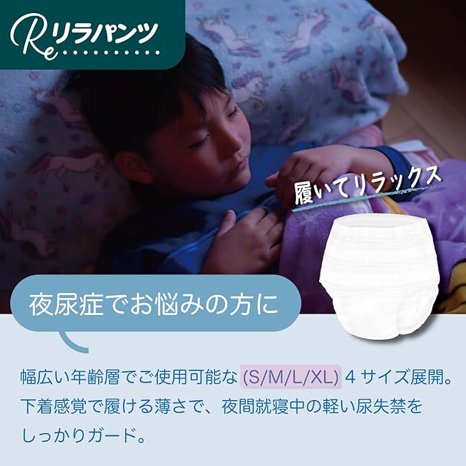 夜尿症でお悩みのお子様にもお使いいただける、(S/M/L/XL)の豊富な4サイズ展開で、夜間就寝中の軽い尿失禁をしっかりガード。