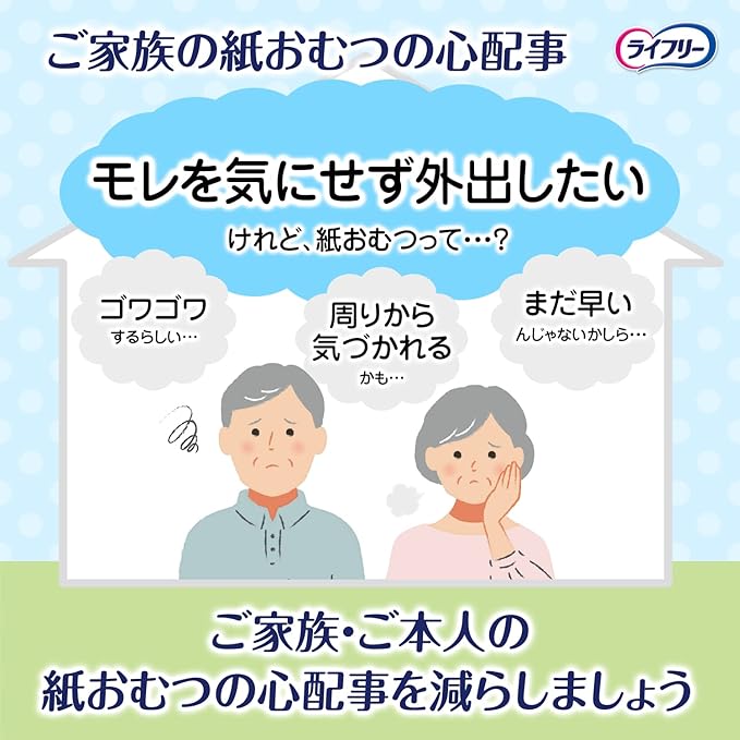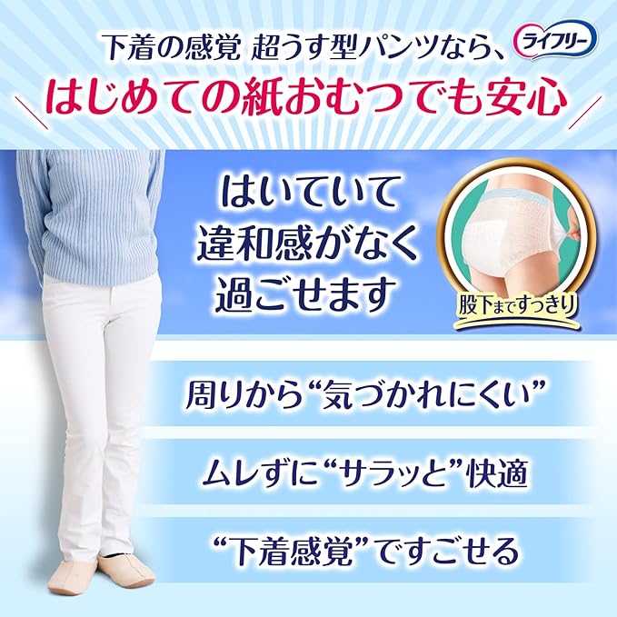 初めての方にも安心な、下着の感覚ではける紙パンツです。超うす吸収体なので下着のようにすっきりフィットし、全面通気シートで、ムレずにさらさら、見た目もはきごこちもすっきり。