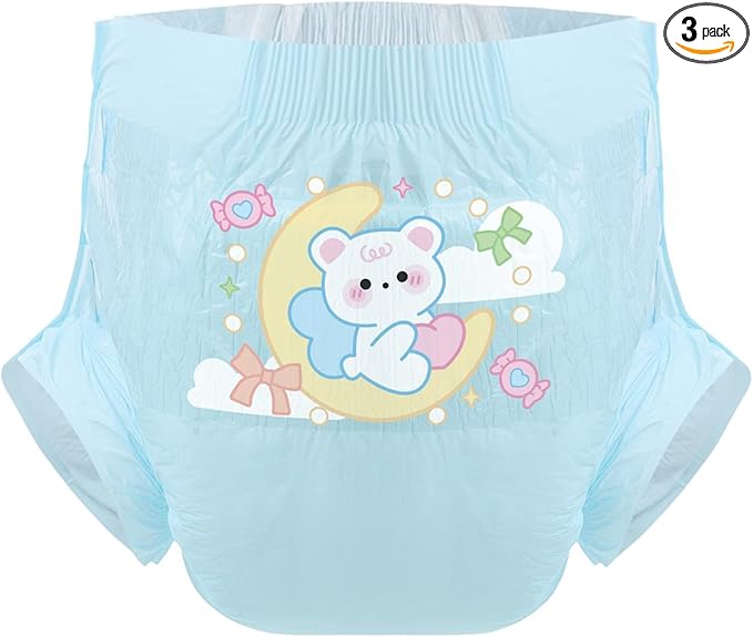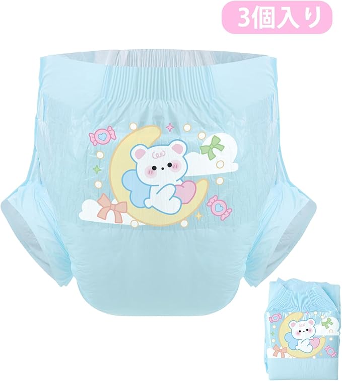 CutiePlusU 大人用おむつ3枚セットサンプル、男女失禁パンツ、ラベル付き、吸収力の高いドライ表面-ブルーバックプレーン かわいいベア(L 95-120cm)