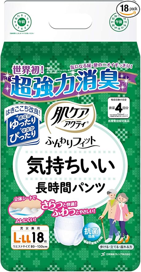 商品名:肌ケア アクティ 大人用おむつ 気持ちいい 長時間パンツ 4回分吸収 L-LLサイズ 18枚 (一人で歩ける方) 品番:4901750803087 メーカー:日本製紙