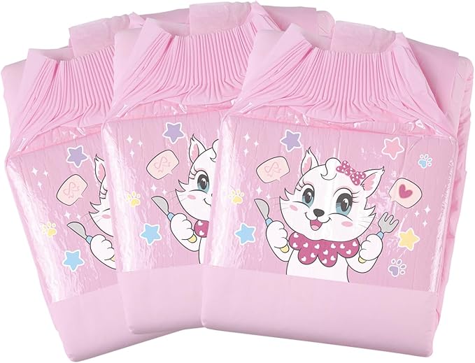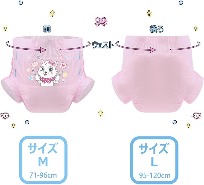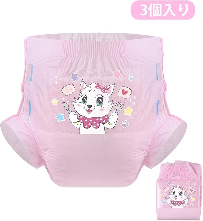 CutiePlusU 大人用おむつ3枚セットサンプル、男女失禁パンツ、ラベル付き、最大夜間吸収率-ピンクバックプレーン キティのディナータイム(M 71-96cm)