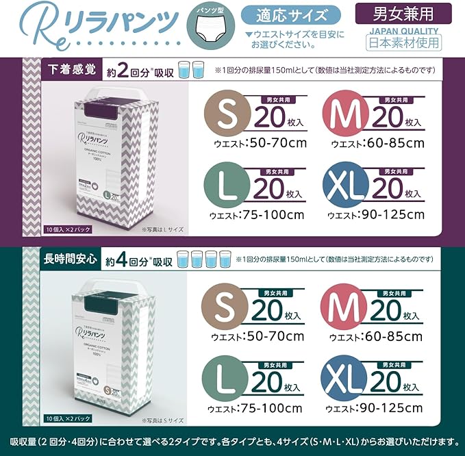 夜尿症でお悩みのお子様にもお使いいただける、(S/M/L/XL)の豊富な4サイズ展開で、夜間就寝中の軽い尿失禁をしっかりガード。