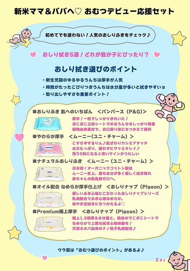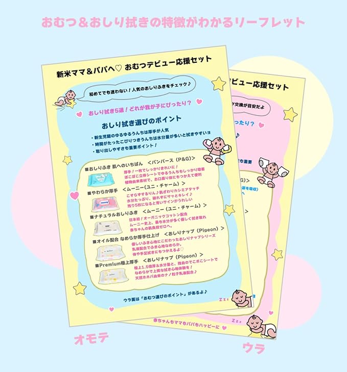 【おむつセット】*新生児用*(「おむつ巾着」と「おむつ&おしり拭きの特徴がわかるリーフレット付き)■おむつ5種類 各2枚 ■おしり拭き(ムーニー:やわらか厚手) ■臭わない袋 2枚 ■オリジナルロゴ入り巾着■おむつ&おしり拭きの特徴がわかるリーフレット <おむつの種類>・パンパース・ナチュラルムーニー・メリーズ・グーン・ムーニー
