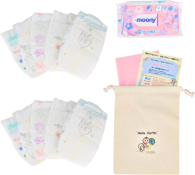 ■おむつ5種類 各2枚(パンパース・ナチュラルムーニー・メリーズ・グーン・ムーニー) ■おしり拭き「ムーニー:やわらか厚手」1パック ■「おむつが臭わない袋(SSサイズ)」2枚 ■巾着(「 " Hello , Earth! " 」ロゴ入り)1個、サイズW200mmxH270mm ■おむつ&おしり拭きの特徴がわかるリーフレット1枚