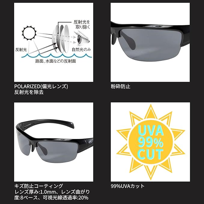 【特徴】反射光を除去し、紫外線フリーの目に優しい光だけを通すポラライズド(偏光レンズ)サングラス!