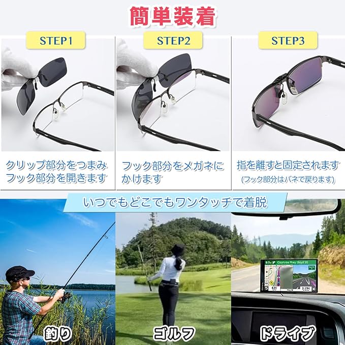 [ZesMark] サングラス 偏光 UVカット 【メガネ拭き ケース付】 眼鏡の上から クリップオン ワンタッチ装着 軽量5g