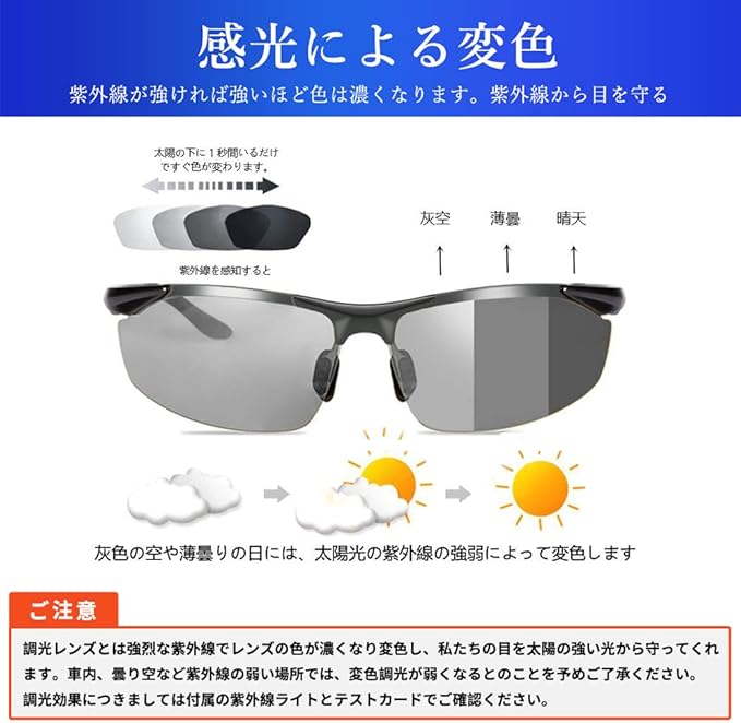 ✅➤【ご注意】調光レンズとは太陽光の紫外線の強弱によって変色しますので、社内、室内、曇り空など紫外線の弱いでは変色調光が弱くなることを予めご了承ください。調光効果につきましては付属の紫外線照射灯(ブルーライト)とテストカードにてご確認ください。