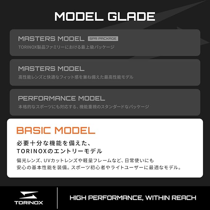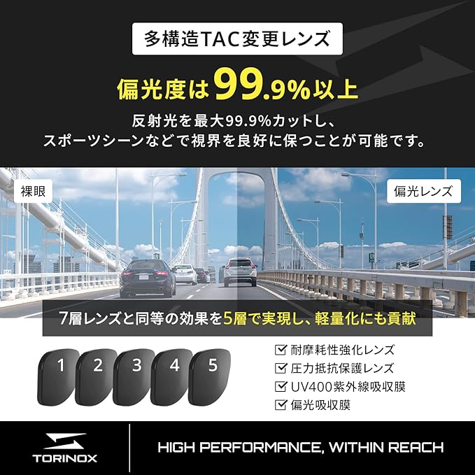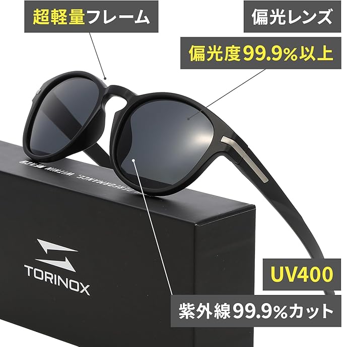 TORINOX(トリノクス)のサングラス(偏光レンズ、軽量設計)はメンズ、レディース問わず、普段使いから運転や釣り等まで幅広くお使い頂けるこれまでに無かったコンセプトのスポーツカジュアルサングラスです。コストと品質(偏光レンズ、UV400、軽量設計)のバランスを重視しアクセスしやすい金額設定でありながら長期間の使用に耐える耐久性とスタイルで運転、釣り、自転車、ドライブ、ロードバイク、野球、ゴルフなどのシーンに対応します。