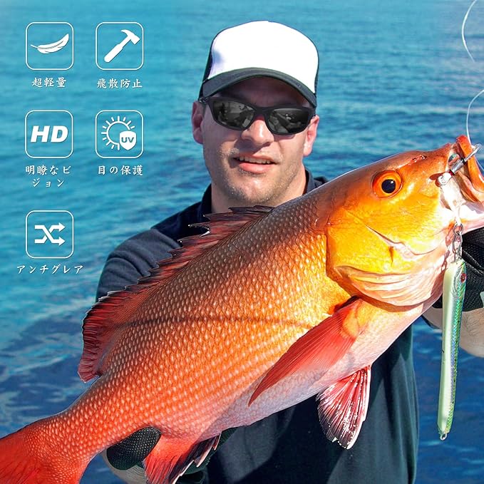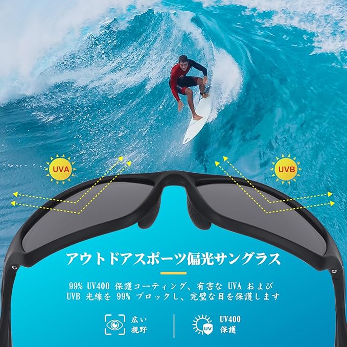 【紫外線防止のスポーツサングラス】目を守るためには、紫外線対策が重要です。偏光の釣り用サングラスは、99%以上の紫外線透過を阻止し、光の透過率を効果的に低減します。紫外線曝露を減らすことで、目の疾患から人々を守ることができます。