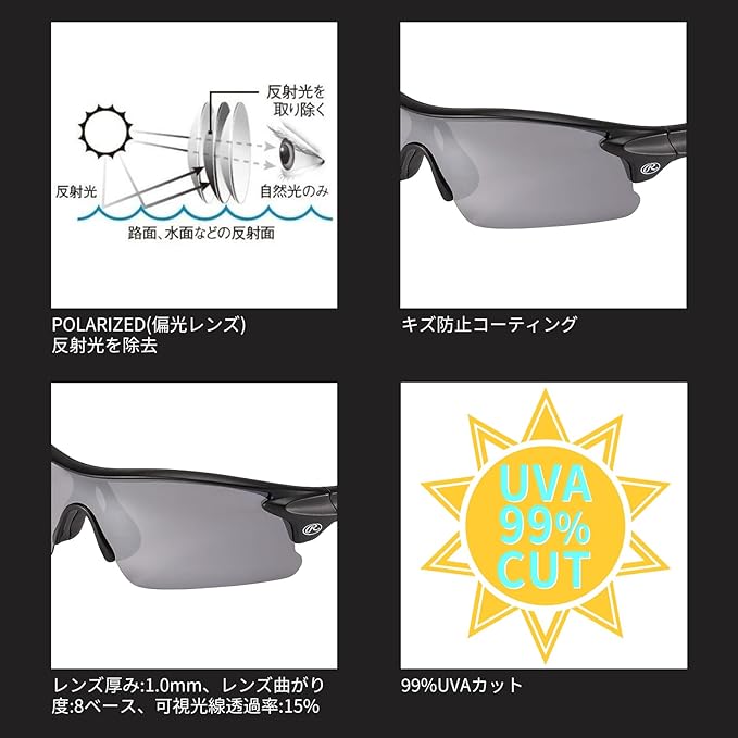 【仕様】偏光レンズ、99%UVAカット、キズ防止コーティング、マイクロファイバーバッグ付き【対応】硬式 軟式 試合 練習 スポーツ