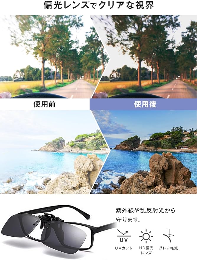 ✅【紫外線UV400カット】偏光レンズが太陽の光、夜間のギラギラとしたライトの反射を抑え、目を保護します。乱反射を抑え視界をクリアにキープ。