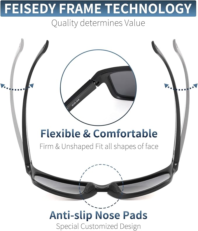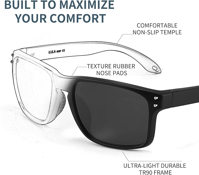 プレミアム素材:TR90フレーム構造により、一日中軽く快適に感じます;木目ゴム鼻当ての設計によりグリップ力が増加し、滑り止め効果を発揮します。 スプリングヒンジは優れた弾性キットを採用しており、テンプルを外側へ伸ばし、曲げたり衝撃に耐えることができます。