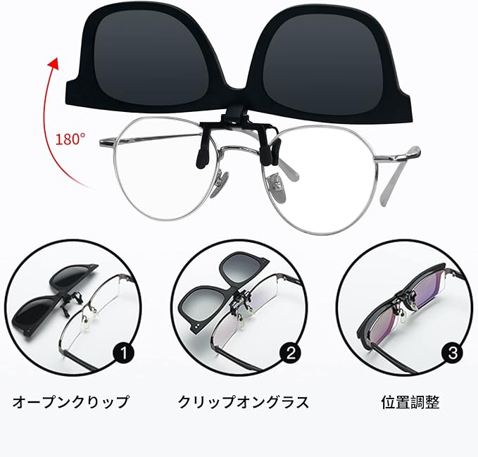 【メガネ着用用サングラス】クリップをメガネにクリップで留めて、着用後でもサングラスを跳ね上げることができます。 UV保護機能付きのクリップオンサングラス。 ほとんどのメガネに適しています。
