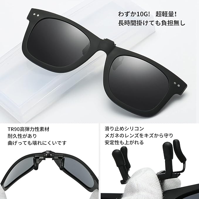 【履きやすい】クリップオンサングラスは使いやすいです。 使用しないときはレンズを跳ね上げることができます。 このサングラスはメガネに簡単にクリップ留めできます。 トンネルなどの暗い場所に入るときは、レンズを上げるだけで取り外す必要はありません。 ワンタッチでメガネに装着できるクリップオン偏光サングラス。 運転時にとても便利です。