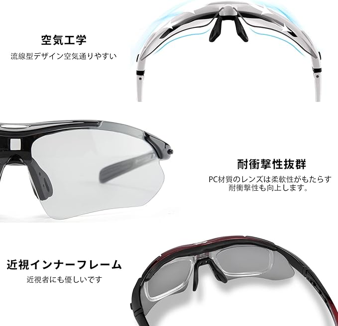 【メリット】1点スポーツバンドが予備し、耳掛けのパーツと付け替え可能です。激しい運動しても、サングラスが滑り落ちないです。1点近視インナーフレームが付属、近視者にも優しいです。デザイン性に優れています。※度付きレンズはお近くのメガネショップで別途装着してください。