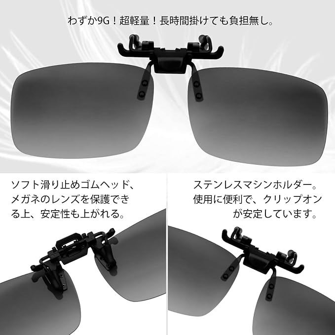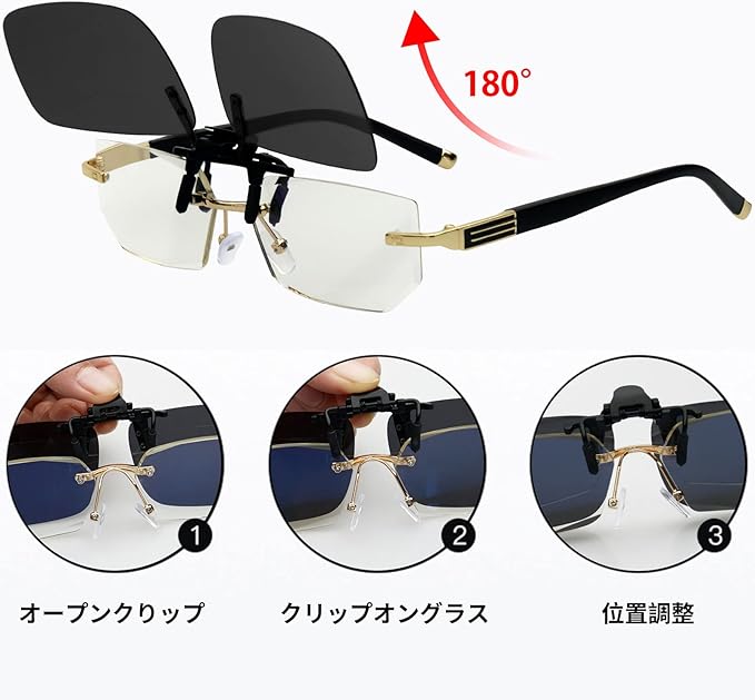 眼鏡着用者へのサングラス:メガネの上から付けられるUVカットのクリップ式サングラスです。クリップをメガネに挟んで、メガネに装着後もサングラス部分を跳ね上げする事ができます。あらゆる種類の金属製及びプラスチック製のフレームに適しています