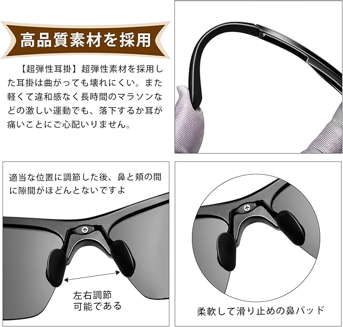 UV400偏光レンズ:夏や日差しが強いときに高性能偏光レンズは紫外線、眩しさや有害なライトをカット、景色は見やすくて目の疲れも軽減でき、真実の色を復元し、よりクリアな視界を提供します。ランニング、キャンプ、旅行、ドライブ、ゴルフ、釣り、自転車、山登り、セーリングなど様々なシーンにも活躍しています。