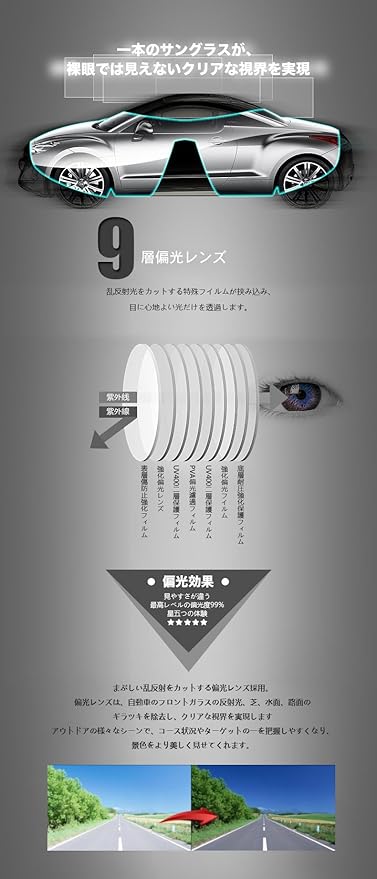 偏光レンズ:99%のUV400保護コーティング、有害な紫外線を100%ブロック、乱反射をカットして心地良い光を取り込むことで目への負担を軽減してくれます。レンズは9層です。1層は表層傷防止強化フィルムです。 2層は強化偏光レンズです。3、4層は6、7層と同じ、耐久性を増すために層を結合し、紫外線を吸収するUV400二層保護フィルムです。5層はPVA偏光濾過フィルムです。8層は強化偏光フィルムです。 9層は飛散防止ための底層耐圧強化保護フィルムです。