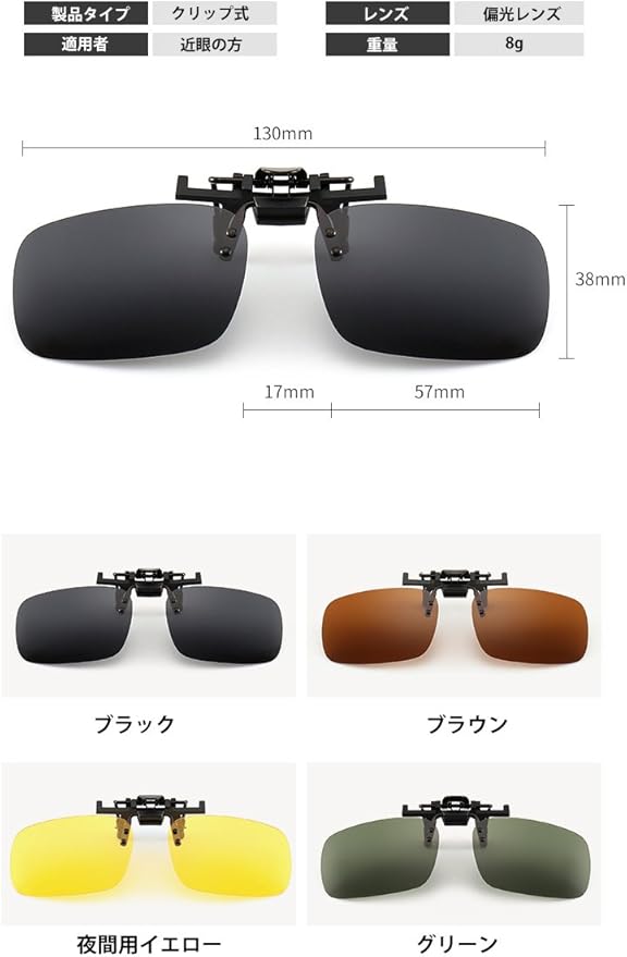 わずか9gの超軽量、最も快適なポラロイド厚型偏光レンズは、 強い耐久性とを持ち、より軽量です。お使いの眼鏡にワンタッチで取り付け可能、跳ね上げ式(クリップオン)なのでトンネルなど暗い所に入る時はい取り外す必要はございません。