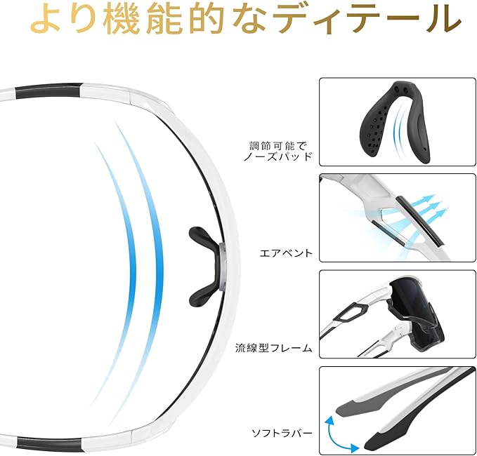 柔軟滑り止めゴム鼻パッド: 汗をかいたときにサングラスが落ちるのを防ぎ、顔にしっかりとフィットする柔軟滑り止めゴム鼻パッド。運転用 サングラスは高品質で超軽量、強度、柔軟性、安定性が高く、高速スポーツ時にクリアな視界を提供しております。ンニング、野球、運転、釣り、登山、オートバイや自転車、レース、スキー、トレッキング、アウトドア、多くのスポーツにこれらの偏光運動サングラスをかけて、負担感じず、長時間つけていても楽なのがうれしい