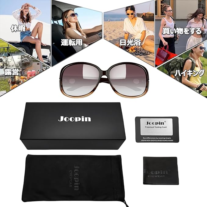 【贈り物にぴったり】セット内容:JOOPINサングラス本体 1、布製バッグ 1、メガネ拭き 1、偏光テストカード 1が付属されています。レディース偏光サングラスは、ファッションな外出をサポートし、強い太陽光を恐れません