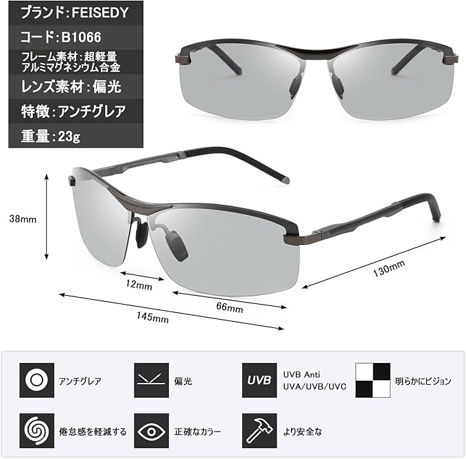 [FEISEDY] サングラス 調光 偏光サングラス メンズ ハーフリムオーバル スポーツサングラス 釣り 運転 おしゃれ ドライブ 野球 ゴルフ ランニング アウトドア UVカットB1066