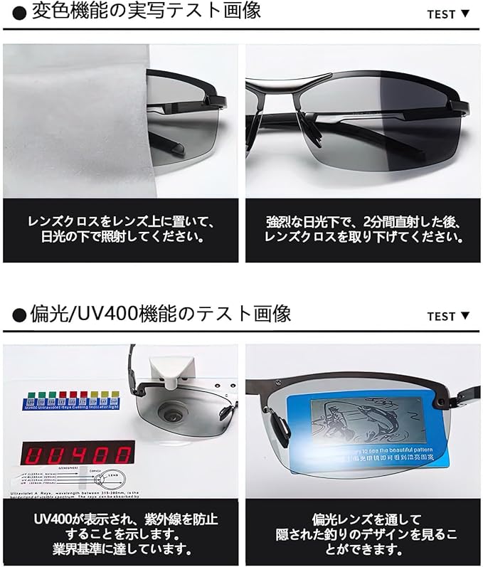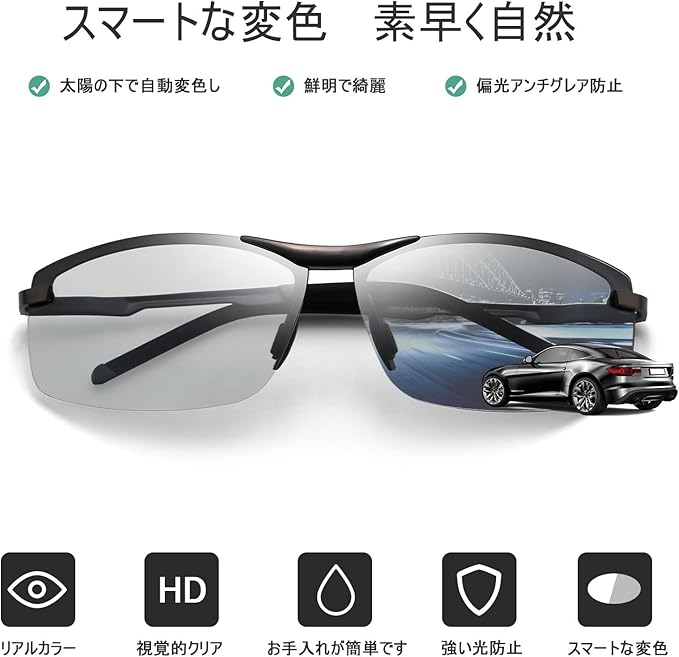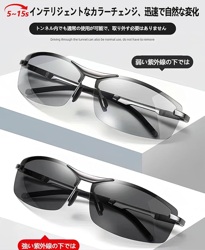 【メガネとサングラスを使い分ける必要がない】調光レンズは紫外線に反応して色がつくため、紫外線の当たらない室内ではほぼ透明に見えます。室内で色のついたサングラスをかけていると違和感がありますが、調光レンズのサングラスならかけっぱなしでもOK。シチュエーションによって使い分ける必要がないので、手間と荷物が減らせます。また、1日中外で過ごす場合や天候が変わりやすい日でも、明るさに応じてレンズの色が変化するため快適に過ごせます。【ご注意】調光レンズとは太陽光の紫外線の強弱によって変色しますので、社内、室内、曇り空など紫外線の弱いでは変色調光が弱くなることを予めご了承ください。調光効果につきましては付属の紫外線照射灯(ブルーライト)とテストカードにてご確認ください。