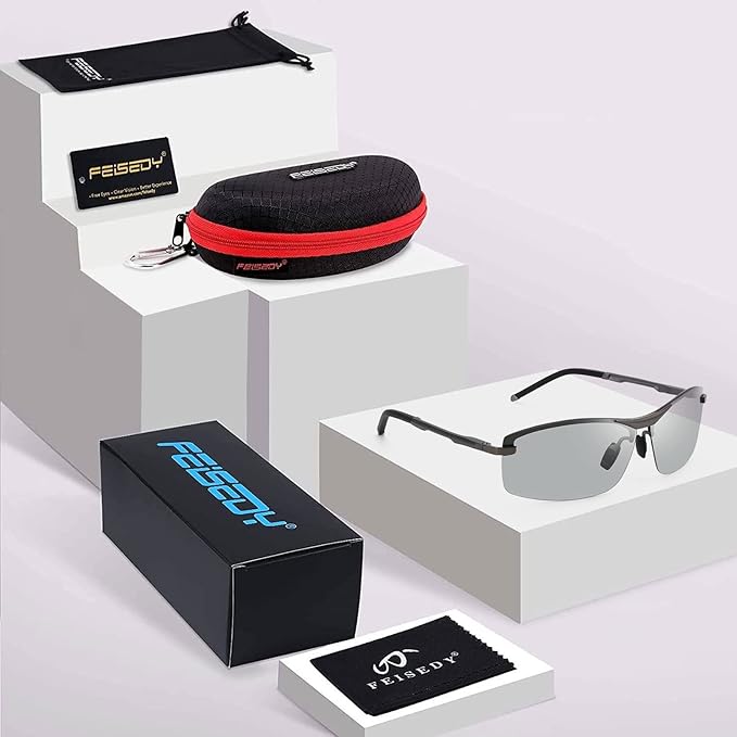 【HD偏光調光レンズ】FEISEDY のHD偏光レンズは、太陽から反射されたまぶしさなどの有害な光を効果的にフィルターし、紫外線99.9%カット! さらに、UV400 保護は、すべての FEISEDY メガネの基本的な要件であり、目が直射日光にさらされるのを効果的に防ぎ、アウトドアでクリアな視界を提供します。長期的なダメージから目を守ります。