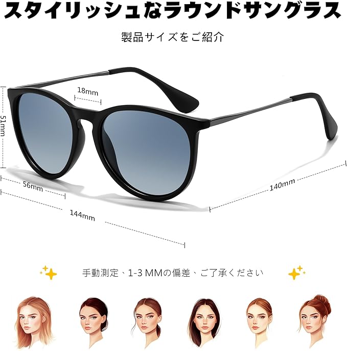 サイズ - レンズ幅: 56mm、レンズ高さ: 51mm、テンプル長: 140mm、ノーズブリッジ幅: 18mm、フレーム幅: 144mm。注意: 手作業による測定のため、1-2mmの誤差が生じる可能性があります。