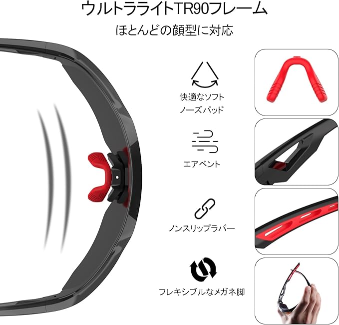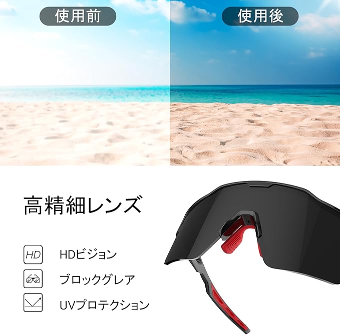 【 高精細偏光ビジョン 】 当社の偏光サングラスレンズは、効果的にグレアを低減し、クリスタルクリアなビジョンを提供し、強い日差しの条件下で乗る自信を与えます。自転車、ランニング、ドライブ、ハイキング、釣りなどに最適です。
