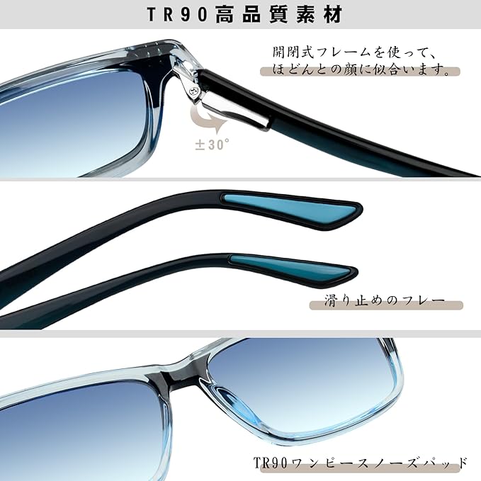 【TR90素材】:TR90は非常に軽い素材で、長時間の着用でも耳や鼻に負担がかかりにくく、快適に使用できます。TR90素材は高い柔軟性を持ち、曲げたりねじったりしても元の形状に戻りやすい特性があります。このため、壊れにくく、耐久性が高いのが特徴です。TR90素材は化学薬品や汗、紫外線に強く、長期間使用しても劣化しにくい性質があります。TR90は環境に優しい素材でもあり、リサイクルが可能であるため、エコフレンドリーな選択肢とされています。