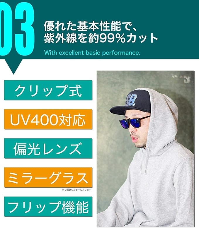 GoodsLand 超軽量 クリップオン サングラス 偏光 調光 跳ね上げ ウェリントン UV 400 カット メンズ レディース GD-CLGL