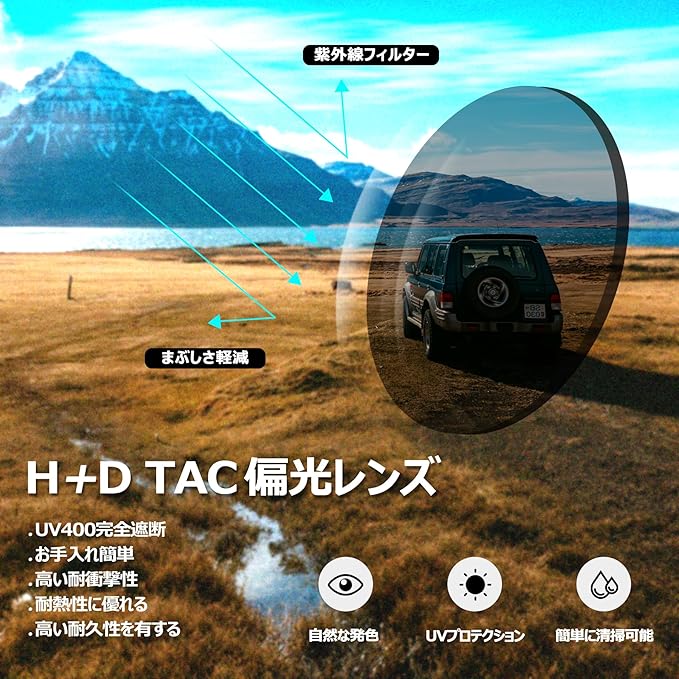 【TAC偏光レンズ】Joopin 運転用サングラスは多層構造の TAC 偏光レンズを採用しており、水面、雪面などからの強い反射光を効果的にフィルターし、グレアを除去します。全方位からあなたの目を守ります