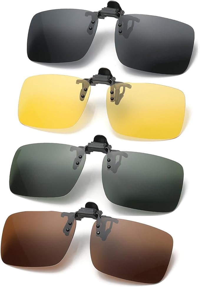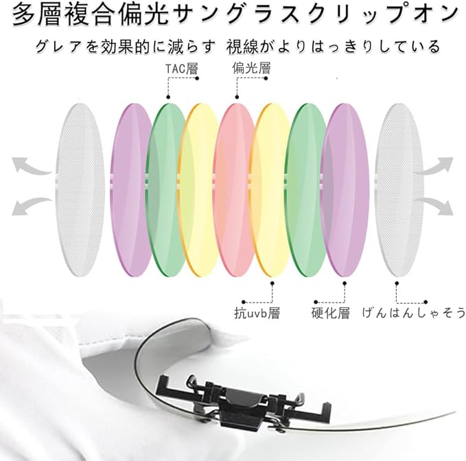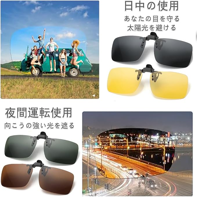 【セット内容】:4つの異なる色の偏光サングラスクリップが含まれており、それぞれダークグレー、ダークグリーン、ブラウン、イエローであり、着用またはアクティブシーンに応じて対応する色を選択して着用することができます。