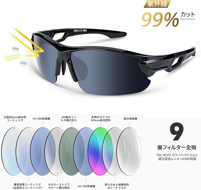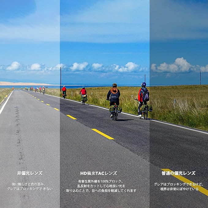 高品質REVO偏光レンズ: すべての偏光レンズは高品質破砕防止TAC材料で作られており、UV 400レンズ保護コーティング、100%有害なUVAとUVB線を遮断する、乱反射をカットして心地良い光を取り込むことできます。反射光や散乱光を排除しやすく、景色をより鮮明で柔らかくすることができます。偏光サングラスは風景をよりクリアで柔らかくし、目の負担を減らします