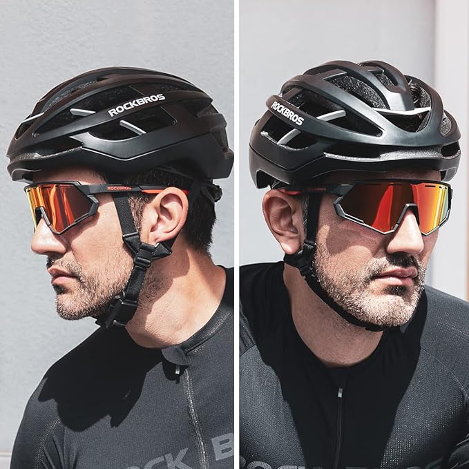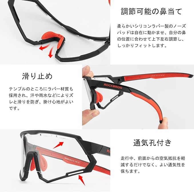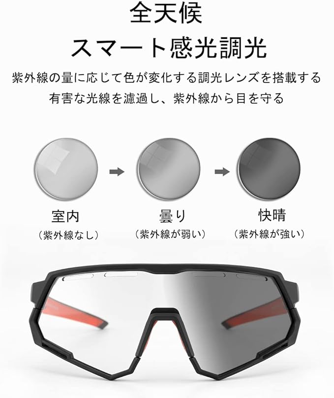 【快適なデザイン】ノーズパッドは上下左右に調整が可能なので、ご自身にちょうど良いフィット感にできます。フレームの底の部分は靭性がよく、取り外しも可能で、フルフレームグラス/ハーフフレームグラスに切り替えます。調光サングラスのレンズにいくつかの通気孔が付き、空気抵抗の軽減とよい通気性を両立させます。度付きレンズを装着できるインナーフレームも付き、近視者に楽に利用できます。(度付きレンズの装着はお近くの眼鏡店へご相談ください)