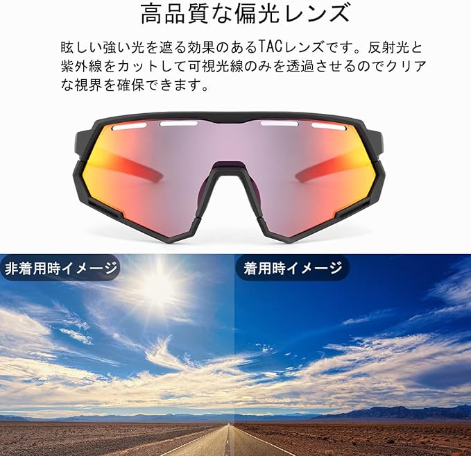 【交換可能レンズ2枚・偏光・調光】交換可能レンズ2枚が付き、偏光・調光機能を併せ持つサングラス!レンズ上部周辺拡張、オーバーグラスのタイプで、視野を広げて、走行中に安全な環境を与えます。※偏光機能:TAC偏光レンズが採用され、偏光サングラスは紫外線や強い反射光をブロックしてクリアな視界を保護してくれます。日差しの強い日中や夕方の地面の反射・水面の反射も軽減してくれます。一日中かけ心地もストレスなく眩しさから解放されて非常に満足します。99.99%のUV400保護コーティングを加工して、日差しや紫外線などの有害な光を99%以上濾過し、目をしっかり守りてくれます。※調光機能:紫外線量によってレンズ濃度が変わるPC調光サングラス、スマート感光調光で、室内ではクリアレンズに、屋外ではサングラスに、と一本二役の便利さを実現します。