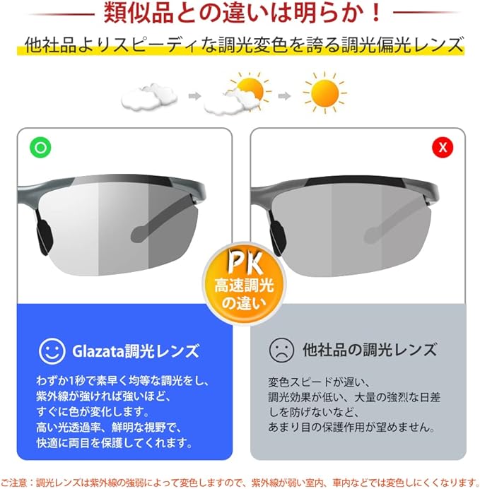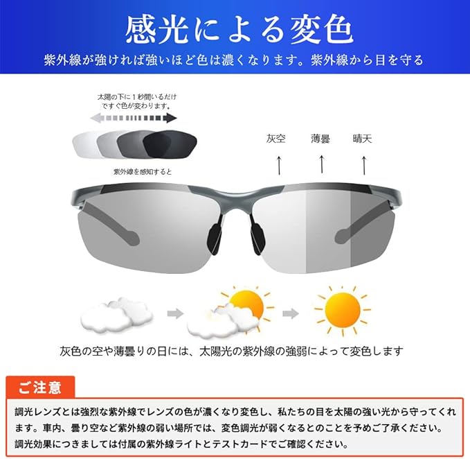✅➤【変色調光】「ご注意:調光レンズとは太陽光の紫外線の強弱によって変色しますので、社内、室内、曇り空など紫外線の弱い所では、変色調光が弱くなることを予めご了承ください。調光効果につきましては付属の紫外線照射灯(ブルーライト)とテストカードにてご確認ください。」調光レンズとは太陽光の紫外線の強弱によって変色します。晴天時の場合、強烈な紫外線よってレンズの色が濃くなり、有効的に私たちの目を太陽の強い光から守ってくれます、雲の多い天気の場合、やや光が抑えめになりレンズの色が若干薄めになることで、視野の明るさを確保し、事故を防ぎます。