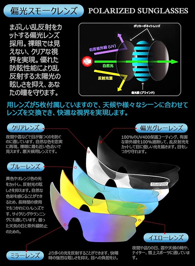 【5つの交換可能レンズ 、フレーム2本】偏光レンズを採用したスポーツサングラス。専用交換レンズ5枚、フレーム2本セット。(交換レンズ5枚のうち偏光レンズ1枚) 一本があれば日常生活を満足できます。フレーム 1本目を無くしたり、壊れても 2本目があります。すぐに2本目を使用出来ます。また、コンパクトで持ち運び便利で、いつでもどこでもお使いいただけます。
