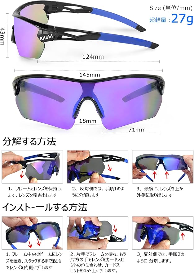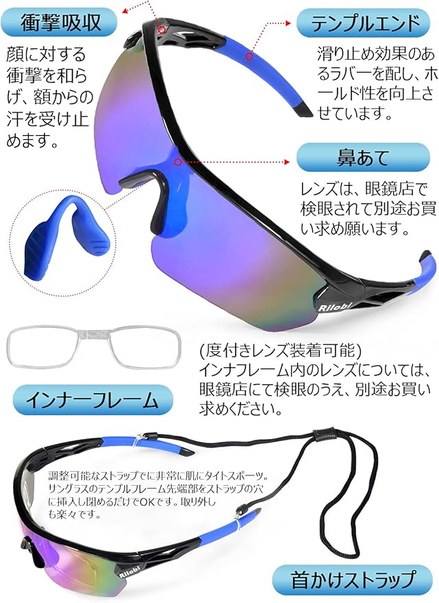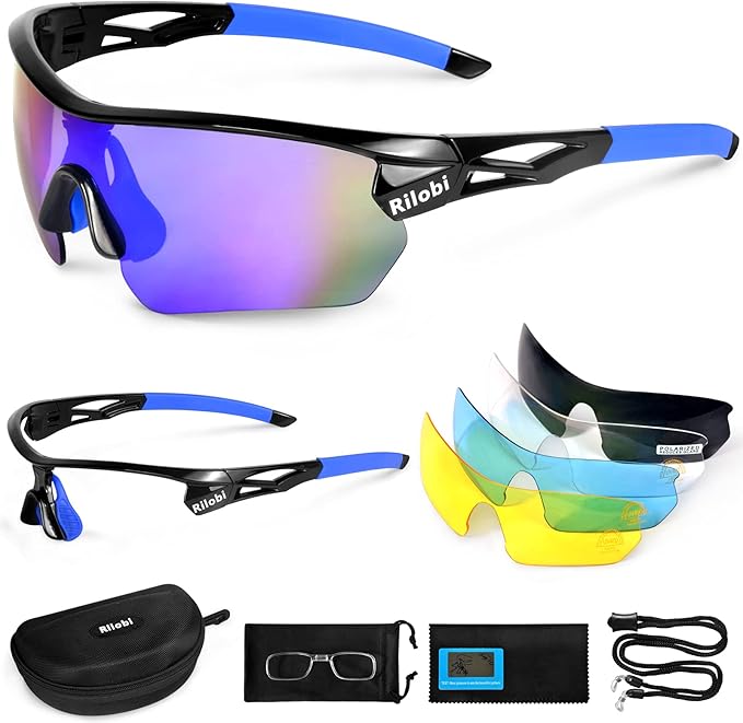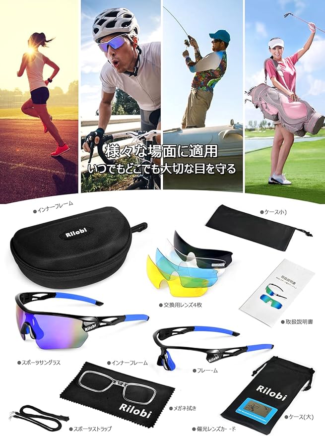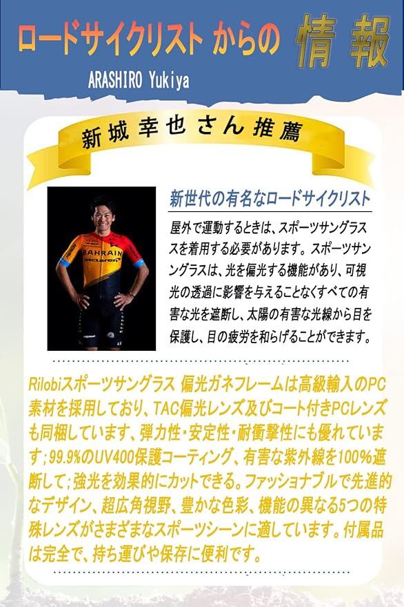 [Rilobi] 【ロードサイクリスト新城幸也の推薦】 偏光スポーツサングラス 交換可能レンズ5枚、フレーム2本 付き、サングラス メンズ レディース 超軽量 UV400 サイクリング ランニング 釣り ゴルフ 野球グラス