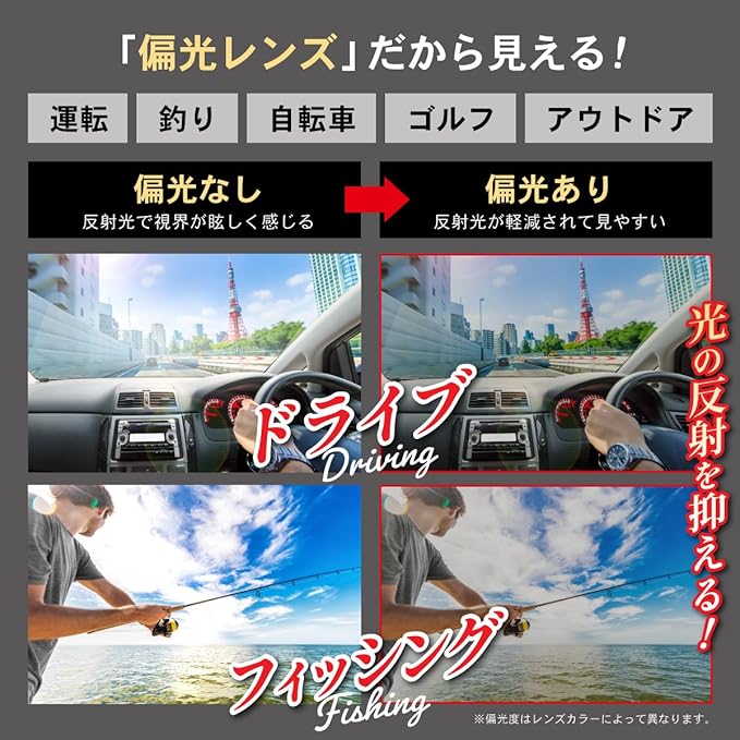 【偏光レンズとは】一般的なサングラスとの大きな違いは、特定の反射光(ギラつき)だけをカットする点です。これにより、単なる眩しさだけでなく、路面や水面からの不快な照り返しを効果的に抑制。クリアで見やすい、爽快な視界を保ちます。さらに、視界を白っぽくさせていた反射光が消えることで、景色が持つ本来の色彩を、よりハッキリと鮮やかに捉えることが可能です。