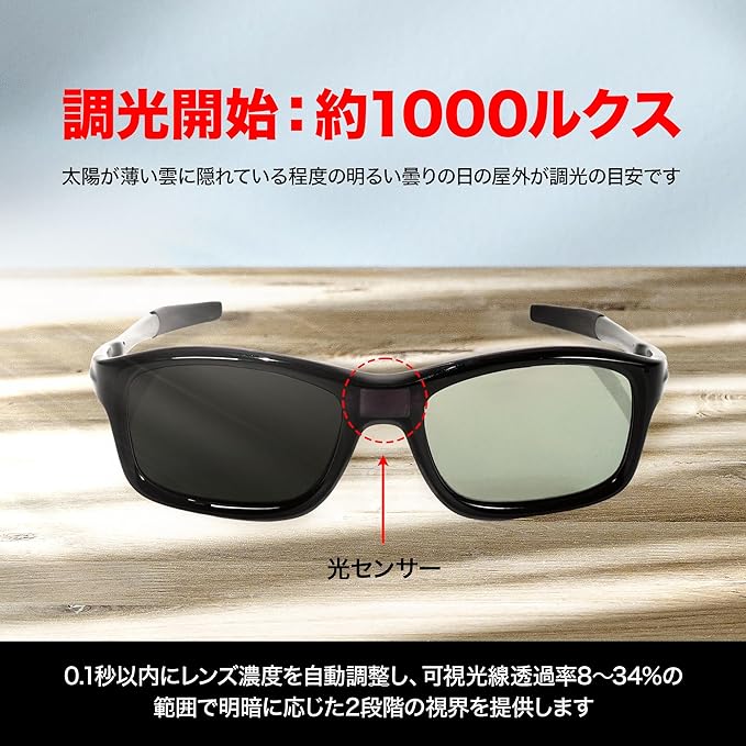 ■仕様:・UV保護レベル: UV400・レンズカラー:グレー、偏光レンズ ・UVカット率:99%以上・可視光線透過率:「34% → 8%」 (太陽光により変動)