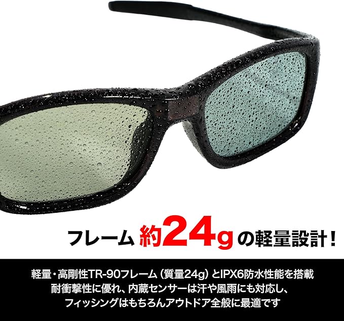 軽量・高剛性 TR-90フレームIPX6の防水性能フレーム質量わずか24g耐衝撃性に優れ、内蔵センサーはIPX6防水、汗や風雨にも安心設計フィッシングのみならずアウトドア全般に対応。