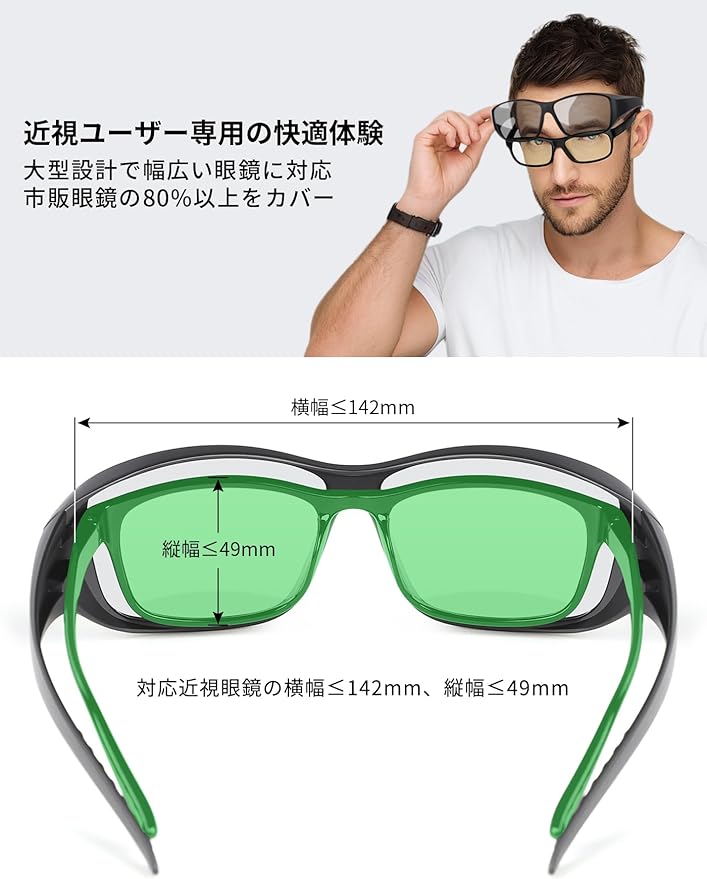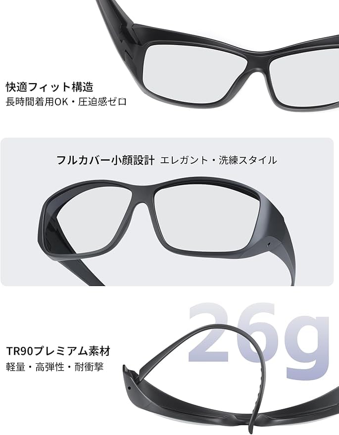 【TR90素材超軽量設計】柔軟性と耐久性に優れたTR90素材を採用し、わずか26gの超軽量を実現。弾力性があるため顔にやさしくフィットし、長時間の着用でも圧迫感がありません。アウトドア活動中の激しい動きにも対応する優れた耐衝撃性を備え、142 49mmまでの近視眼鏡に対応する高い互換性でオーバーグラス機能も充実しています。