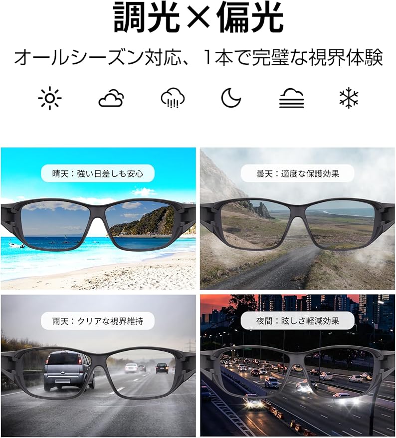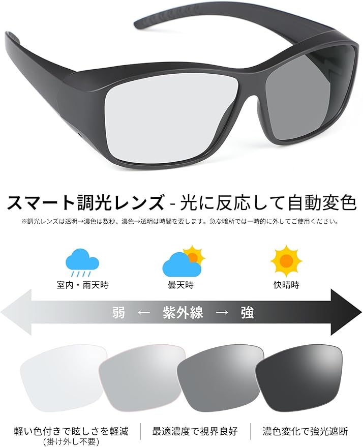【最新調光技術搭載】室内では透明、屋外では自動的に濃いサングラスに変化する革新的な調光レンズを搭載。紫外線量に応じてわずか数秒で最適な濃度に調整し、一日中快適な視界を提供します。さらに偏光機能により、水面のギラつきや路面の反射光を効果的にカット。釣りやドライブ時の視界がクリアになり、目の疲労を大幅に軽減します。