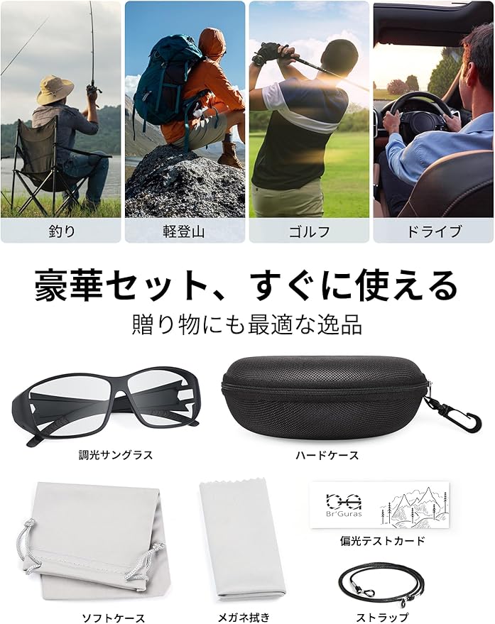 [Br'Guras] 調光サングラス 変色偏光サングラス フルカバー オーバーグラス TR90 釣り 登山 キャンプ ゴルフ ドライブ 日常使用 近視対応 UV400 調光レンズ 男女兼用 おしゃれ 超軽量26g 小顔効果 豪華5点セット