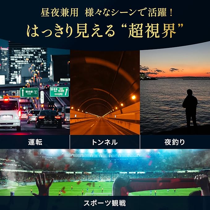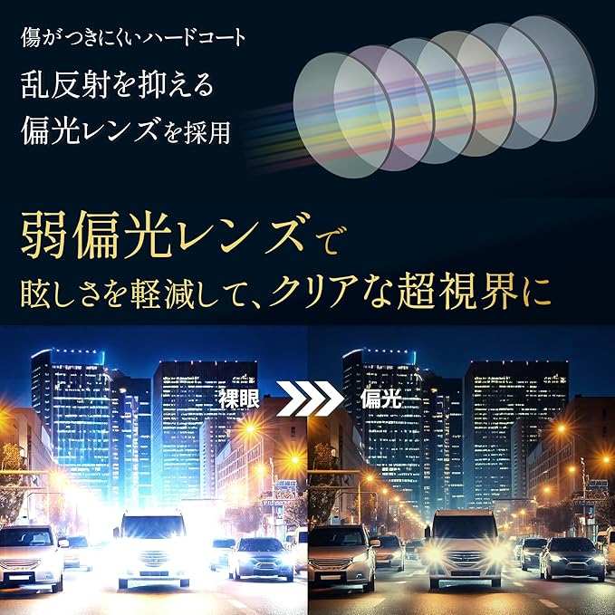 【雨の日やトンネルでもクリアな視界】通常の偏光サングラスでは暗くなりがちな環境でも、明るく鮮明な視界をキープ。夜間運転、悪天候時、トンネル走行でもストレスのない見やすさを実現。日常使いにもおすすめのサングラス メンズモデルです。