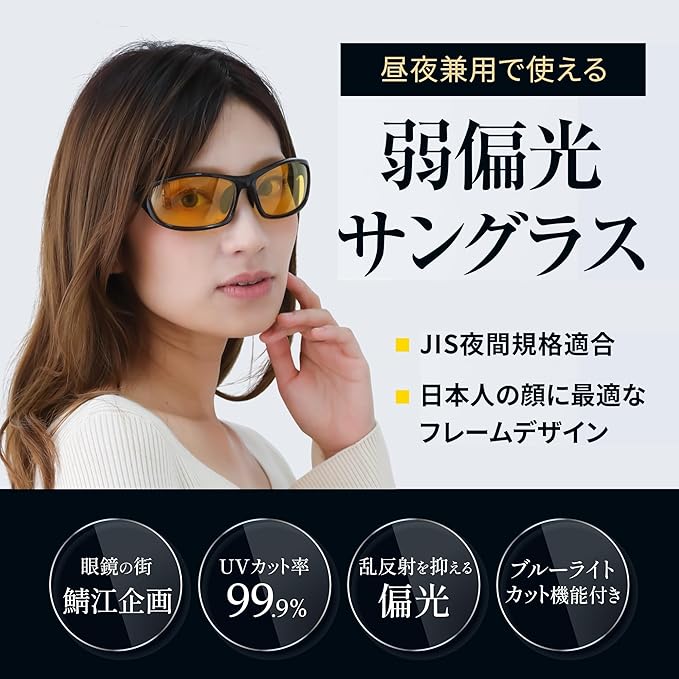 【夜間に強い!明るさ重視の弱偏光レンズ】ルミナスイエローの弱偏光レンズを採用。偏光度30%でヘッドライトや濡れた路面のギラつきを軽減。可視光線透過率75%以上で暗さを感じにくく、夜間や雨天時にも明るい視界を確保するスポーツサングラスです。