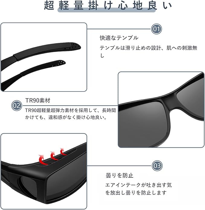 【メガネの上からオーバーサングラス】眼鏡着用者へのサングラス。近視、遠視、老視の眼鏡かけた人もご利用できます。ゆったりとした構造で圧迫感がありません、掛け心地良い。